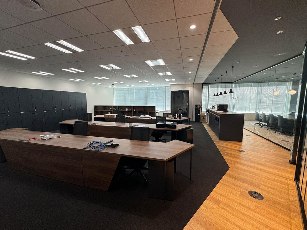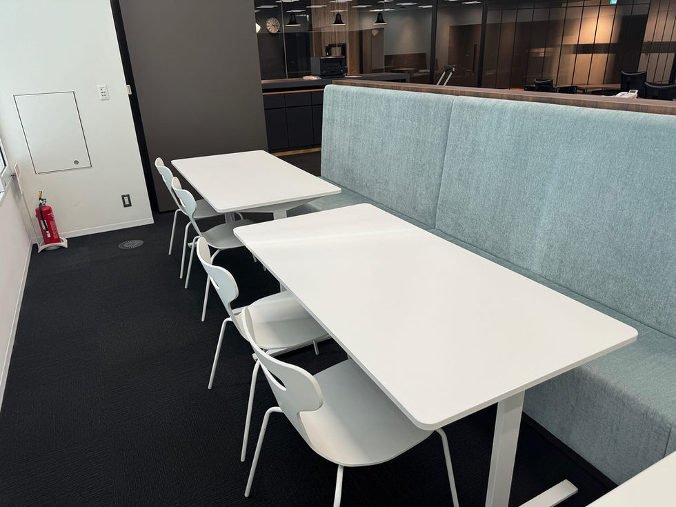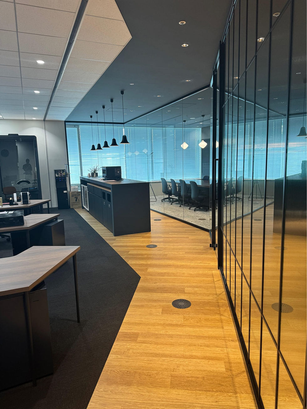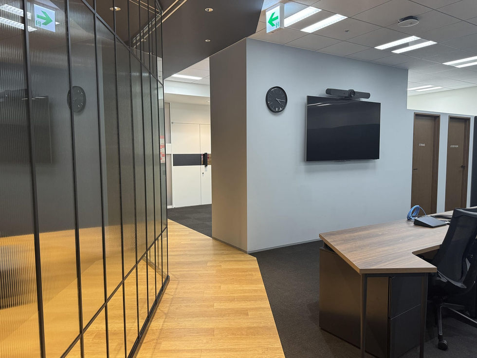 エントランス、会議室、執務エリアをガラスパー ティションで仕切った、開放的なオフィス。グレーとベージュ、木目を基調に、落ち着いた空間に仕上げながらも、ブラックのラインを引くことで凛とした印象を持たせている。執務エリアには他拠点とリモートでつながる機能を持たせ、それを最大限に活かすレイアウトとした。
